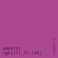 Цвет #AB4791 в цветовой модели RGB обозначается тремя октетами (171, 71, 145) в десятичном формате и #AB4791 в шестнадцатиричном (hex) формате, которые являются интенсивностью красного 171 (hex AB), интенсивность зелёного 71 (hex 47) и интенсивность синего 145 (hex 91).