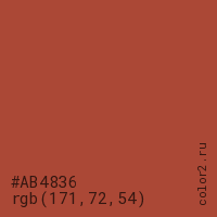 Цвет #AB4836 в цветовой модели RGB обозначается тремя октетами (171, 72, 54) в десятичном формате и #AB4836 в шестнадцатиричном (hex) формате, которые являются интенсивностью красного 171 (hex AB), интенсивность зелёного 72 (hex 48) и интенсивность синего 54 (hex 36).