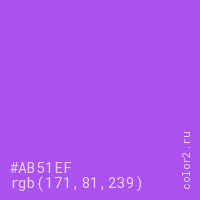 Цвет #AB51EF в цветовой модели RGB обозначается тремя октетами (171, 81, 239) в десятичном формате и #AB51EF в шестнадцатиричном (hex) формате, которые являются интенсивностью красного 171 (hex AB), интенсивность зелёного 81 (hex 51) и интенсивность синего 239 (hex EF).