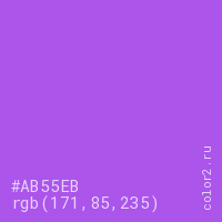 Цвет #AB55EB в цветовой модели RGB обозначается тремя октетами (171, 85, 235) в десятичном формате и #AB55EB в шестнадцатиричном (hex) формате, которые являются интенсивностью красного 171 (hex AB), интенсивность зелёного 85 (hex 55) и интенсивность синего 235 (hex EB).