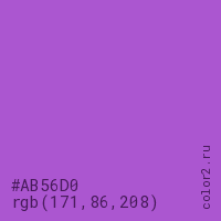 Цвет #AB56D0 в цветовой модели RGB обозначается тремя октетами (171, 86, 208) в десятичном формате и #AB56D0 в шестнадцатиричном (hex) формате, которые являются интенсивностью красного 171 (hex AB), интенсивность зелёного 86 (hex 56) и интенсивность синего 208 (hex D0).