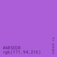 Цвет #AB5ED8 в цветовой модели RGB обозначается тремя октетами (171, 94, 216) в десятичном формате и #AB5ED8 в шестнадцатиричном (hex) формате, которые являются интенсивностью красного 171 (hex AB), интенсивность зелёного 94 (hex 5E) и интенсивность синего 216 (hex D8).