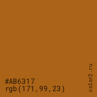 Цвет #AB6317 в цветовой модели RGB обозначается тремя октетами (171, 99, 23) в десятичном формате и #AB6317 в шестнадцатиричном (hex) формате, которые являются интенсивностью красного 171 (hex AB), интенсивность зелёного 99 (hex 63) и интенсивность синего 23 (hex 17).