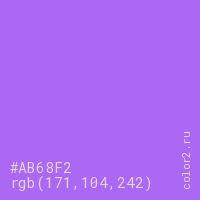 Цвет #AB68F2 в цветовой модели RGB обозначается тремя октетами (171, 104, 242) в десятичном формате и #AB68F2 в шестнадцатиричном (hex) формате, которые являются интенсивностью красного 171 (hex AB), интенсивность зелёного 104 (hex 68) и интенсивность синего 242 (hex F2).