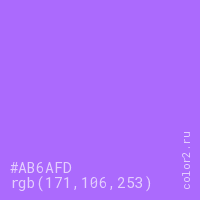 Цвет #AB6AFD в цветовой модели RGB обозначается тремя октетами (171, 106, 253) в десятичном формате и #AB6AFD в шестнадцатиричном (hex) формате, которые являются интенсивностью красного 171 (hex AB), интенсивность зелёного 106 (hex 6A) и интенсивность синего 253 (hex FD).
