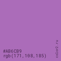 Цвет #AB6CB9 в цветовой модели RGB обозначается тремя октетами (171, 108, 185) в десятичном формате и #AB6CB9 в шестнадцатиричном (hex) формате, которые являются интенсивностью красного 171 (hex AB), интенсивность зелёного 108 (hex 6C) и интенсивность синего 185 (hex B9).