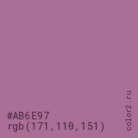 Цвет #AB6E97 в цветовой модели RGB обозначается тремя октетами (171, 110, 151) в десятичном формате и #AB6E97 в шестнадцатиричном (hex) формате, которые являются интенсивностью красного 171 (hex AB), интенсивность зелёного 110 (hex 6E) и интенсивность синего 151 (hex 97).