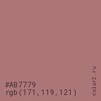 Цвет #AB7779 в цветовой модели RGB обозначается тремя октетами (171, 119, 121) в десятичном формате и #AB7779 в шестнадцатиричном (hex) формате, которые являются интенсивностью красного 171 (hex AB), интенсивность зелёного 119 (hex 77) и интенсивность синего 121 (hex 79).