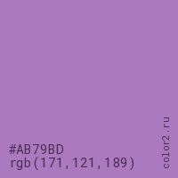 Цвет RGB(171, 121, 189) в процентом отношении количества цвета состоит из 67.1% красного (red), 47.5% зелёного (green) и 74.1% синего (blue).