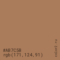 Цвет #AB7C5B в цветовой модели RGB обозначается тремя октетами (171, 124, 91) в десятичном формате и #AB7C5B в шестнадцатиричном (hex) формате, которые являются интенсивностью красного 171 (hex AB), интенсивность зелёного 124 (hex 7C) и интенсивность синего 91 (hex 5B).