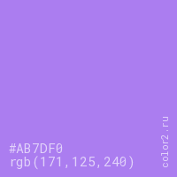 Цвет #AB7DF0 в цветовой модели RGB обозначается тремя октетами (171, 125, 240) в десятичном формате и #AB7DF0 в шестнадцатиричном (hex) формате, которые являются интенсивностью красного 171 (hex AB), интенсивность зелёного 125 (hex 7D) и интенсивность синего 240 (hex F0).