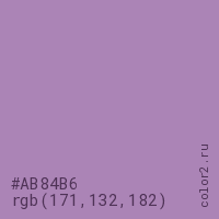 Цвет #AB84B6 в цветовой модели RGB обозначается тремя октетами (171, 132, 182) в десятичном формате и #AB84B6 в шестнадцатиричном (hex) формате, которые являются интенсивностью красного 171 (hex AB), интенсивность зелёного 132 (hex 84) и интенсивность синего 182 (hex B6).