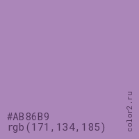 Цвет #AB86B9 в цветовой модели RGB обозначается тремя октетами (171, 134, 185) в десятичном формате и #AB86B9 в шестнадцатиричном (hex) формате, которые являются интенсивностью красного 171 (hex AB), интенсивность зелёного 134 (hex 86) и интенсивность синего 185 (hex B9).