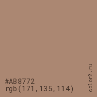 Цвет #AB8772 в цветовой модели RGB обозначается тремя октетами (171, 135, 114) в десятичном формате и #AB8772 в шестнадцатиричном (hex) формате, которые являются интенсивностью красного 171 (hex AB), интенсивность зелёного 135 (hex 87) и интенсивность синего 114 (hex 72).