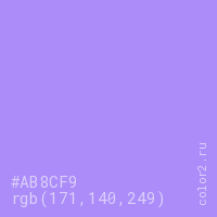 Цвет RGB(171, 140, 249) в процентом отношении количества цвета состоит из 67.1% красного (red), 54.9% зелёного (green) и 97.6% синего (blue).