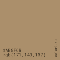 Цвет #AB8F6B в цветовой модели RGB обозначается тремя октетами (171, 143, 107) в десятичном формате и #AB8F6B в шестнадцатиричном (hex) формате, которые являются интенсивностью красного 171 (hex AB), интенсивность зелёного 143 (hex 8F) и интенсивность синего 107 (hex 6B).