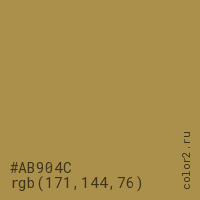 Цвет #AB904C в цветовой модели RGB обозначается тремя октетами (171, 144, 76) в десятичном формате и #AB904C в шестнадцатиричном (hex) формате, которые являются интенсивностью красного 171 (hex AB), интенсивность зелёного 144 (hex 90) и интенсивность синего 76 (hex 4C).
