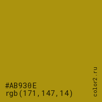Цвет #AB930E в цветовой модели RGB обозначается тремя октетами (171, 147, 14) в десятичном формате и #AB930E в шестнадцатиричном (hex) формате, которые являются интенсивностью красного 171 (hex AB), интенсивность зелёного 147 (hex 93) и интенсивность синего 14 (hex 0E).