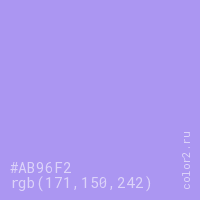 Цвет #AB96F2 в цветовой модели RGB обозначается тремя октетами (171, 150, 242) в десятичном формате и #AB96F2 в шестнадцатиричном (hex) формате, которые являются интенсивностью красного 171 (hex AB), интенсивность зелёного 150 (hex 96) и интенсивность синего 242 (hex F2).