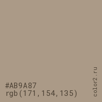 Цвет #AB9A87 в цветовой модели RGB обозначается тремя октетами (171, 154, 135) в десятичном формате и #AB9A87 в шестнадцатиричном (hex) формате, которые являются интенсивностью красного 171 (hex AB), интенсивность зелёного 154 (hex 9A) и интенсивность синего 135 (hex 87).