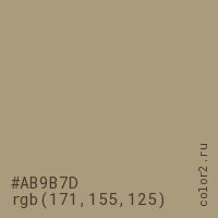 Цвет #AB9B7D в цветовой модели RGB обозначается тремя октетами (171, 155, 125) в десятичном формате и #AB9B7D в шестнадцатиричном (hex) формате, которые являются интенсивностью красного 171 (hex AB), интенсивность зелёного 155 (hex 9B) и интенсивность синего 125 (hex 7D).