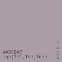 Цвет #AB9DA7 в цветовой модели RGB обозначается тремя октетами (171, 157, 167) в десятичном формате и #AB9DA7 в шестнадцатиричном (hex) формате, которые являются интенсивностью красного 171 (hex AB), интенсивность зелёного 157 (hex 9D) и интенсивность синего 167 (hex A7).