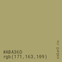 Цвет #ABA36D в цветовой модели RGB обозначается тремя октетами (171, 163, 109) в десятичном формате и #ABA36D в шестнадцатиричном (hex) формате, которые являются интенсивностью красного 171 (hex AB), интенсивность зелёного 163 (hex A3) и интенсивность синего 109 (hex 6D).