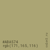 Цвет #ABA574 в цветовой модели RGB обозначается тремя октетами (171, 165, 116) в десятичном формате и #ABA574 в шестнадцатиричном (hex) формате, которые являются интенсивностью красного 171 (hex AB), интенсивность зелёного 165 (hex A5) и интенсивность синего 116 (hex 74).