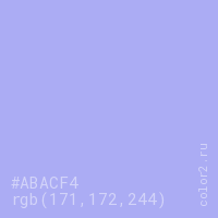 Цвет #ABACF4 в цветовой модели RGB обозначается тремя октетами (171, 172, 244) в десятичном формате и #ABACF4 в шестнадцатиричном (hex) формате, которые являются интенсивностью красного 171 (hex AB), интенсивность зелёного 172 (hex AC) и интенсивность синего 244 (hex F4).