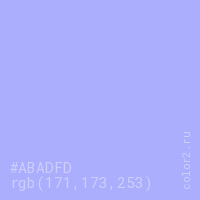 Цвет #ABADFD в цветовой модели RGB обозначается тремя октетами (171, 173, 253) в десятичном формате и #ABADFD в шестнадцатиричном (hex) формате, которые являются интенсивностью красного 171 (hex AB), интенсивность зелёного 173 (hex AD) и интенсивность синего 253 (hex FD).