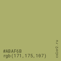 Цвет #ABAF6B в цветовой модели RGB обозначается тремя октетами (171, 175, 107) в десятичном формате и #ABAF6B в шестнадцатиричном (hex) формате, которые являются интенсивностью красного 171 (hex AB), интенсивность зелёного 175 (hex AF) и интенсивность синего 107 (hex 6B).