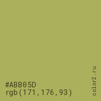 Цвет #ABB05D в цветовой модели RGB обозначается тремя октетами (171, 176, 93) в десятичном формате и #ABB05D в шестнадцатиричном (hex) формате, которые являются интенсивностью красного 171 (hex AB), интенсивность зелёного 176 (hex B0) и интенсивность синего 93 (hex 5D).