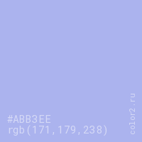 Цвет #ABB3EE в цветовой модели RGB обозначается тремя октетами (171, 179, 238) в десятичном формате и #ABB3EE в шестнадцатиричном (hex) формате, которые являются интенсивностью красного 171 (hex AB), интенсивность зелёного 179 (hex B3) и интенсивность синего 238 (hex EE).