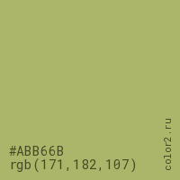 Цвет #ABB66B в цветовой модели RGB обозначается тремя октетами (171, 182, 107) в десятичном формате и #ABB66B в шестнадцатиричном (hex) формате, которые являются интенсивностью красного 171 (hex AB), интенсивность зелёного 182 (hex B6) и интенсивность синего 107 (hex 6B).
