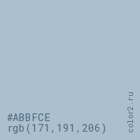 Цвет #ABBFCE в цветовой модели RGB обозначается тремя октетами (171, 191, 206) в десятичном формате и #ABBFCE в шестнадцатиричном (hex) формате, которые являются интенсивностью красного 171 (hex AB), интенсивность зелёного 191 (hex BF) и интенсивность синего 206 (hex CE).