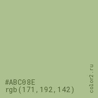 Цвет #ABC08E в цветовой модели RGB обозначается тремя октетами (171, 192, 142) в десятичном формате и #ABC08E в шестнадцатиричном (hex) формате, которые являются интенсивностью красного 171 (hex AB), интенсивность зелёного 192 (hex C0) и интенсивность синего 142 (hex 8E).