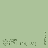 Цвет #ABC299 в цветовой модели RGB обозначается тремя октетами (171, 194, 153) в десятичном формате и #ABC299 в шестнадцатиричном (hex) формате, которые являются интенсивностью красного 171 (hex AB), интенсивность зелёного 194 (hex C2) и интенсивность синего 153 (hex 99).