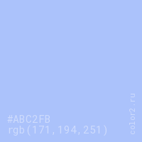 Цвет #ABC2FB в цветовой модели RGB обозначается тремя октетами (171, 194, 251) в десятичном формате и #ABC2FB в шестнадцатиричном (hex) формате, которые являются интенсивностью красного 171 (hex AB), интенсивность зелёного 194 (hex C2) и интенсивность синего 251 (hex FB).