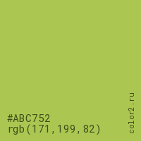 Цвет #ABC752 в цветовой модели RGB обозначается тремя октетами (171, 199, 82) в десятичном формате и #ABC752 в шестнадцатиричном (hex) формате, которые являются интенсивностью красного 171 (hex AB), интенсивность зелёного 199 (hex C7) и интенсивность синего 82 (hex 52).