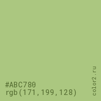 Цвет #ABC780 в цветовой модели RGB обозначается тремя октетами (171, 199, 128) в десятичном формате и #ABC780 в шестнадцатиричном (hex) формате, которые являются интенсивностью красного 171 (hex AB), интенсивность зелёного 199 (hex C7) и интенсивность синего 128 (hex 80).