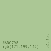 Цвет #ABC795 в цветовой модели RGB обозначается тремя октетами (171, 199, 149) в десятичном формате и #ABC795 в шестнадцатиричном (hex) формате, которые являются интенсивностью красного 171 (hex AB), интенсивность зелёного 199 (hex C7) и интенсивность синего 149 (hex 95).