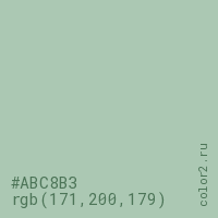 Цвет #ABC8B3 в цветовой модели RGB обозначается тремя октетами (171, 200, 179) в десятичном формате и #ABC8B3 в шестнадцатиричном (hex) формате, которые являются интенсивностью красного 171 (hex AB), интенсивность зелёного 200 (hex C8) и интенсивность синего 179 (hex B3).