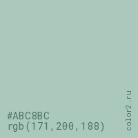 Цвет #ABC8BC в цветовой модели RGB обозначается тремя октетами (171, 200, 188) в десятичном формате и #ABC8BC в шестнадцатиричном (hex) формате, которые являются интенсивностью красного 171 (hex AB), интенсивность зелёного 200 (hex C8) и интенсивность синего 188 (hex BC).