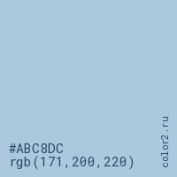 Цвет #ABC8DC в цветовой модели RGB обозначается тремя октетами (171, 200, 220) в десятичном формате и #ABC8DC в шестнадцатиричном (hex) формате, которые являются интенсивностью красного 171 (hex AB), интенсивность зелёного 200 (hex C8) и интенсивность синего 220 (hex DC).