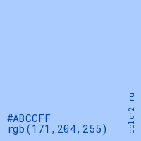 Цвет #ABCCFF в цветовой модели RGB обозначается тремя октетами (171, 204, 255) в десятичном формате и #ABCCFF в шестнадцатиричном (hex) формате, которые являются интенсивностью красного 171 (hex AB), интенсивность зелёного 204 (hex CC) и интенсивность синего 255 (hex FF).