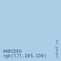Цвет #ABCDE6 в цветовой модели RGB обозначается тремя октетами (171, 205, 230) в десятичном формате и #ABCDE6 в шестнадцатиричном (hex) формате, которые являются интенсивностью красного 171 (hex AB), интенсивность зелёного 205 (hex CD) и интенсивность синего 230 (hex E6).
