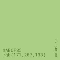 Цвет #ABCF85 в цветовой модели RGB обозначается тремя октетами (171, 207, 133) в десятичном формате и #ABCF85 в шестнадцатиричном (hex) формате, которые являются интенсивностью красного 171 (hex AB), интенсивность зелёного 207 (hex CF) и интенсивность синего 133 (hex 85).