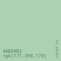 Цвет #ABD0B2 в цветовой модели RGB обозначается тремя октетами (171, 208, 178) в десятичном формате и #ABD0B2 в шестнадцатиричном (hex) формате, которые являются интенсивностью красного 171 (hex AB), интенсивность зелёного 208 (hex D0) и интенсивность синего 178 (hex B2).