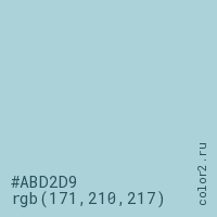 Цвет #ABD2D9 в цветовой модели RGB обозначается тремя октетами (171, 210, 217) в десятичном формате и #ABD2D9 в шестнадцатиричном (hex) формате, которые являются интенсивностью красного 171 (hex AB), интенсивность зелёного 210 (hex D2) и интенсивность синего 217 (hex D9).
