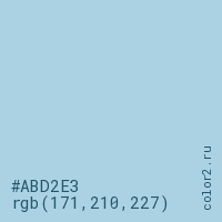 Цвет #ABD2E3 в цветовой модели RGB обозначается тремя октетами (171, 210, 227) в десятичном формате и #ABD2E3 в шестнадцатиричном (hex) формате, которые являются интенсивностью красного 171 (hex AB), интенсивность зелёного 210 (hex D2) и интенсивность синего 227 (hex E3).